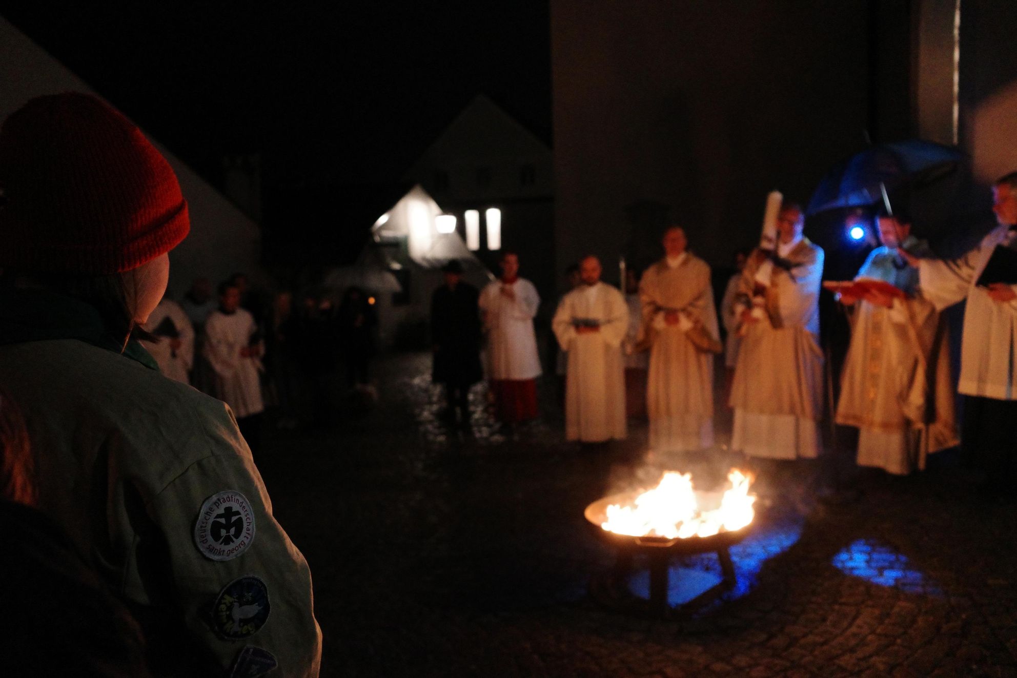 Auch dieses Jahr haben wir mit der Pfadfinderstufe wieder das Osterfeuer für den Auferstehungsgottesdienst in der Stadtpfarrkirche Samstag Abend um 21h gemacht. Wir haben das Feuer entzündet in dem viele Bäum- und Kräuterbüschel verbrannt wurden, dann geweiht und die Osterkerze entzündet wurde.